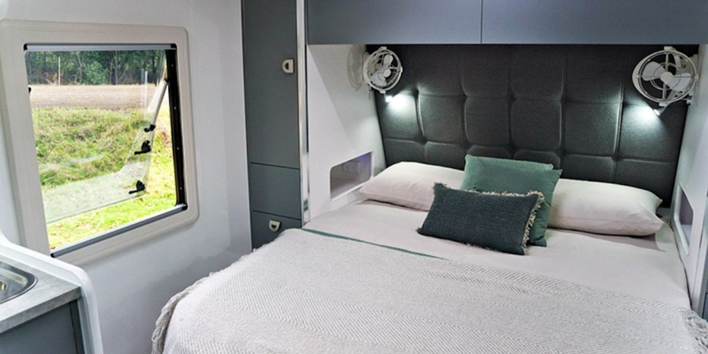 This caravan is equipped with a range of convenient amenities, including a dinette, one-piece front wall, LED lighting, and an oversised 80-litre fridge. Additionally, it offers style with its sleek cabinetry and bedhead design.