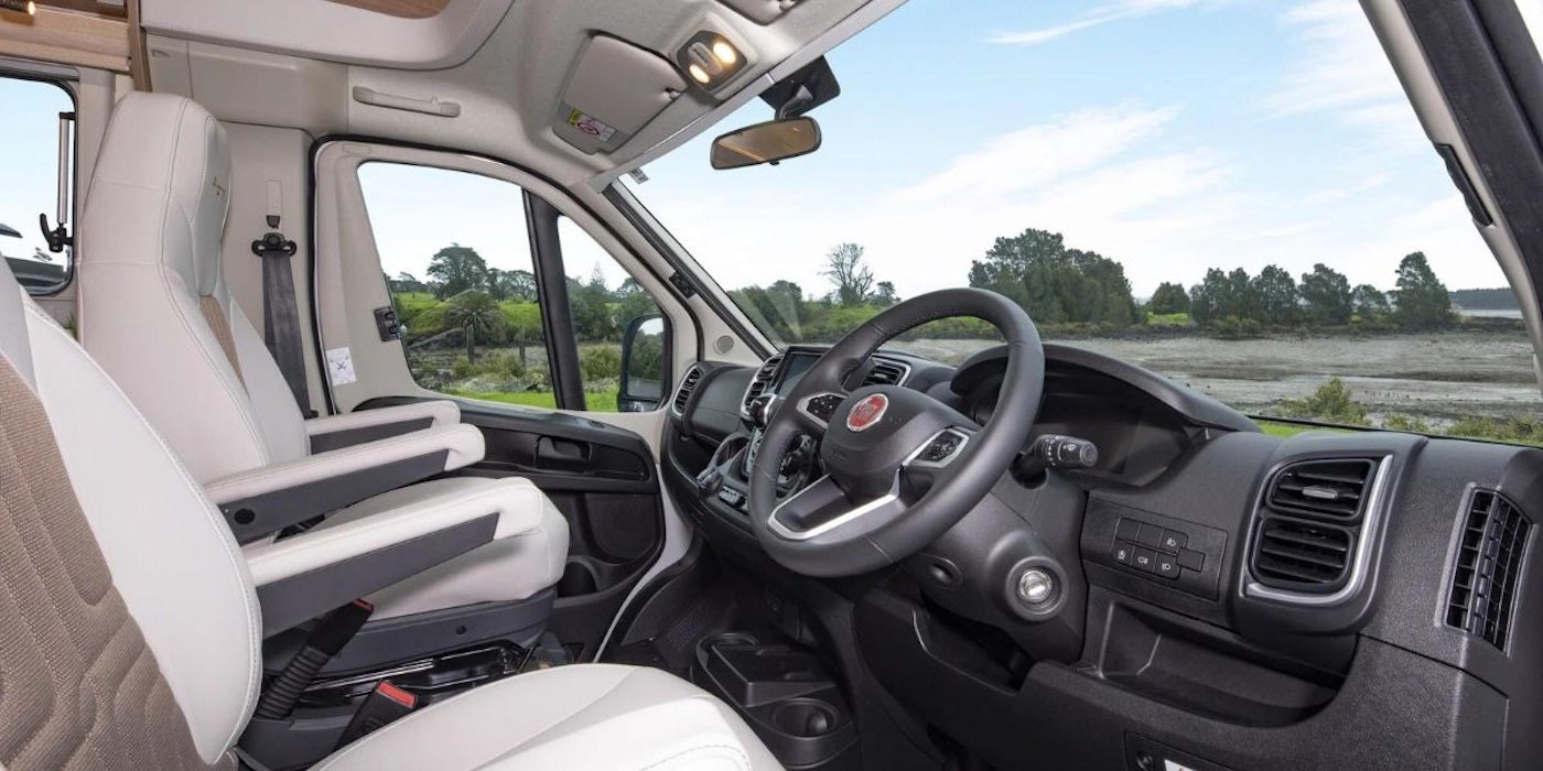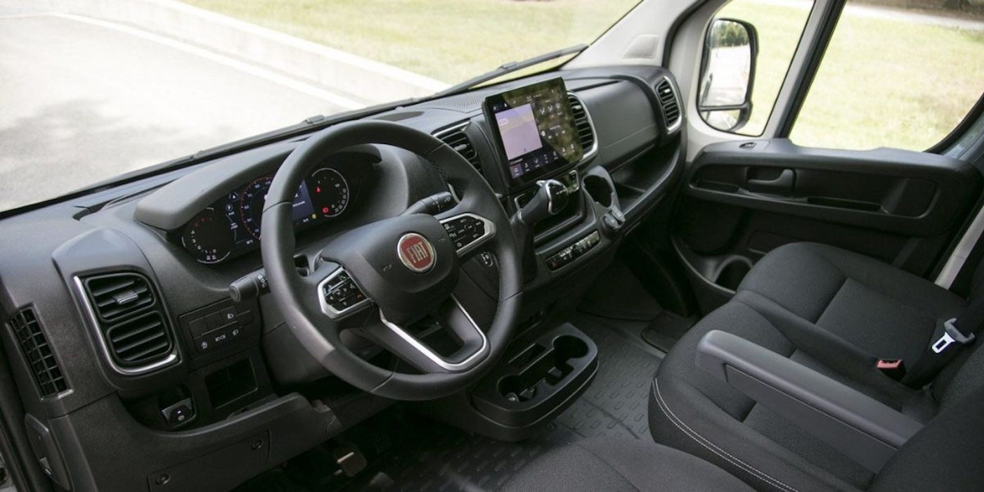 The Fiat Ducato interior offers plenty of room, comfortable driver and passenger seats, and modern steering wheel controls.