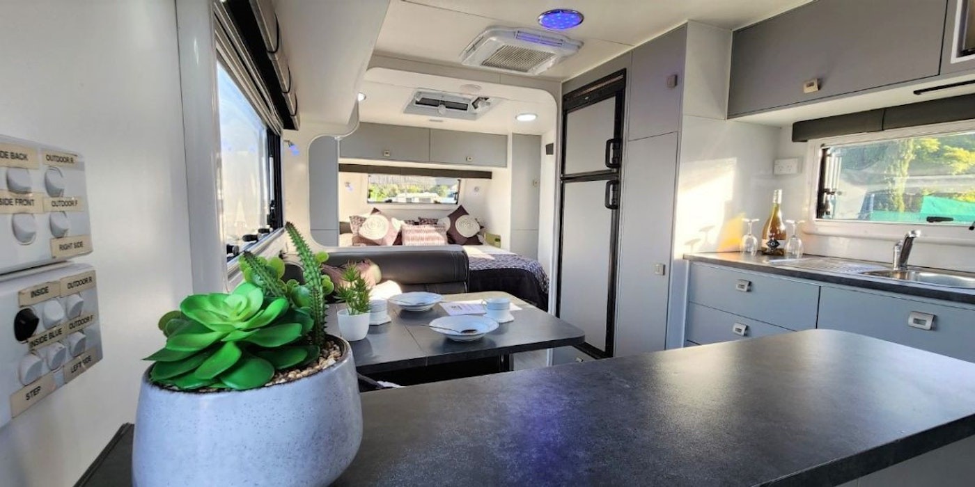 Inside, you'll find a cafe lounge area with footrests, providing a cozy spot for relaxation and socialising. The caravan's well-designed kitchen features a stove with three gas and one electric burner option, allowing you to cook with versatility. The oven and grill offer convenience for baking and grilling your favourite meals, while the range hood keeps your cooking area clean and smoke-free.