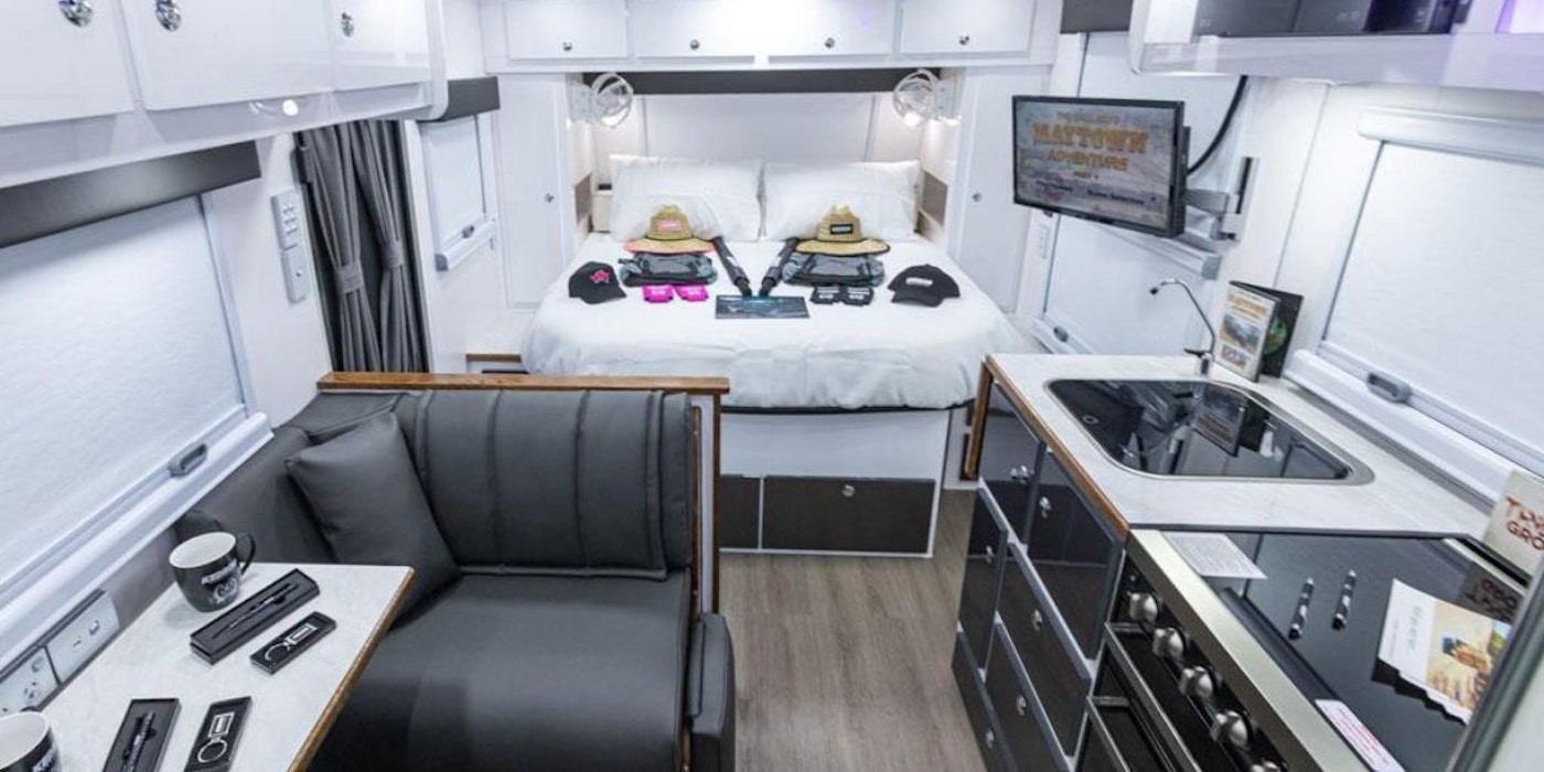 The Kedron Topender TE5 stands out with its attention to detail and major features like a 100l water tank, microwave oven, and a front window area, making it a top choice among caravan enthusiasts.