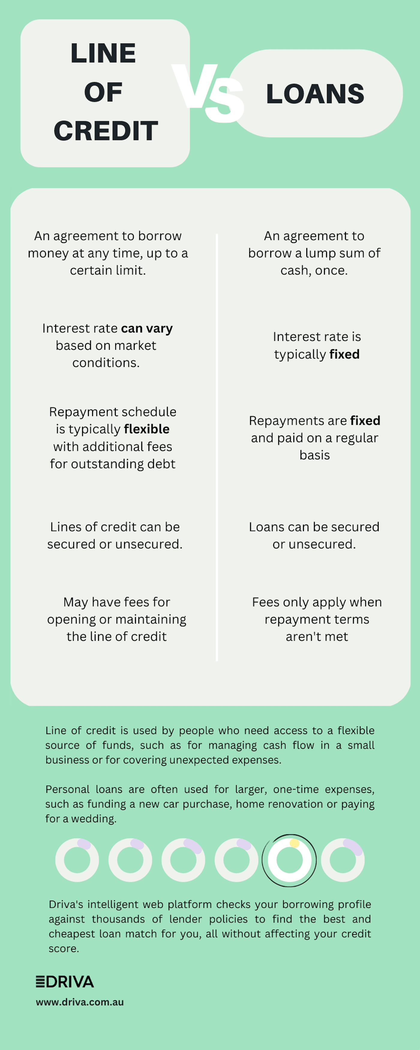This is where Driva can help, we match you with multiple loan options from a range of 30+ Aussie lenders. Our intelligent web platform checks your borrowing profile against thousands of lender policies to find the best and cheapest loan match for you, all without affecting your credit score.