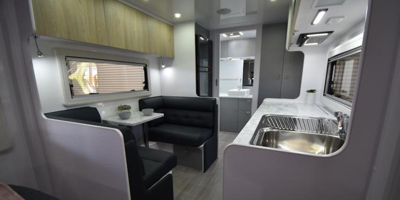 This caravan is equipped with a range of convenient amenities, including a dinette, one-piece front wall, LED lighting, and an oversised 80-litre fridge. Additionally, it offers style with its sleek cabinetry and bedhead design.