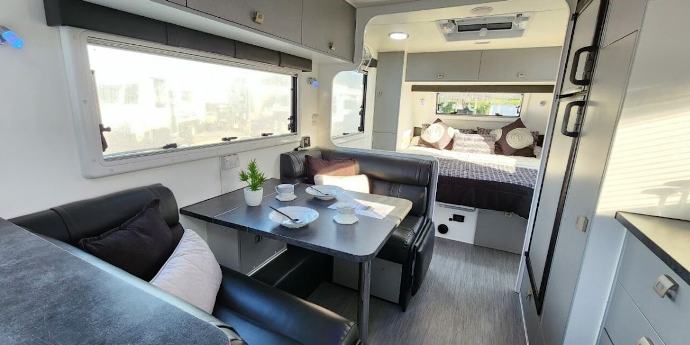 The interior of the Galaxy Nemesis offers a comfortable and well-equipped living space. With its soft walls and ceilings in white and creams, the caravan creates a light and airy atmosphere, making it feel spacious and inviting. The kitchen area adds a touch of colour with blue hues on the splashback, adding a stylish element to the space.