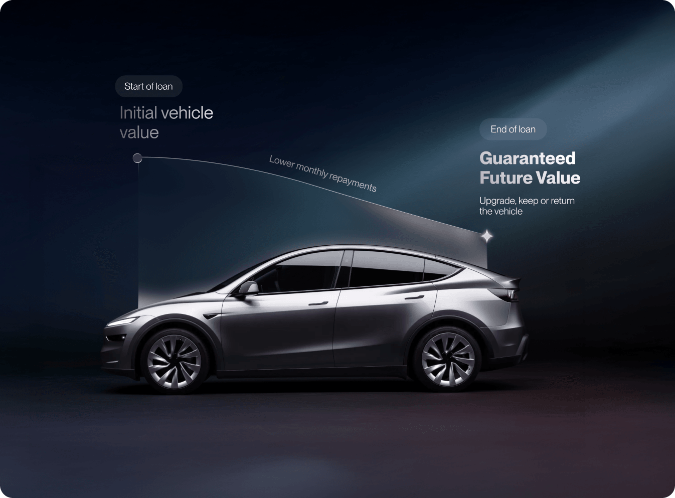 Your Tesla’s minimum future value is agreed upfront, helping protect you from unexpected changes in the resale market. You’ll know where you stand at the end of your loan, without relying on estimates or assumptions.